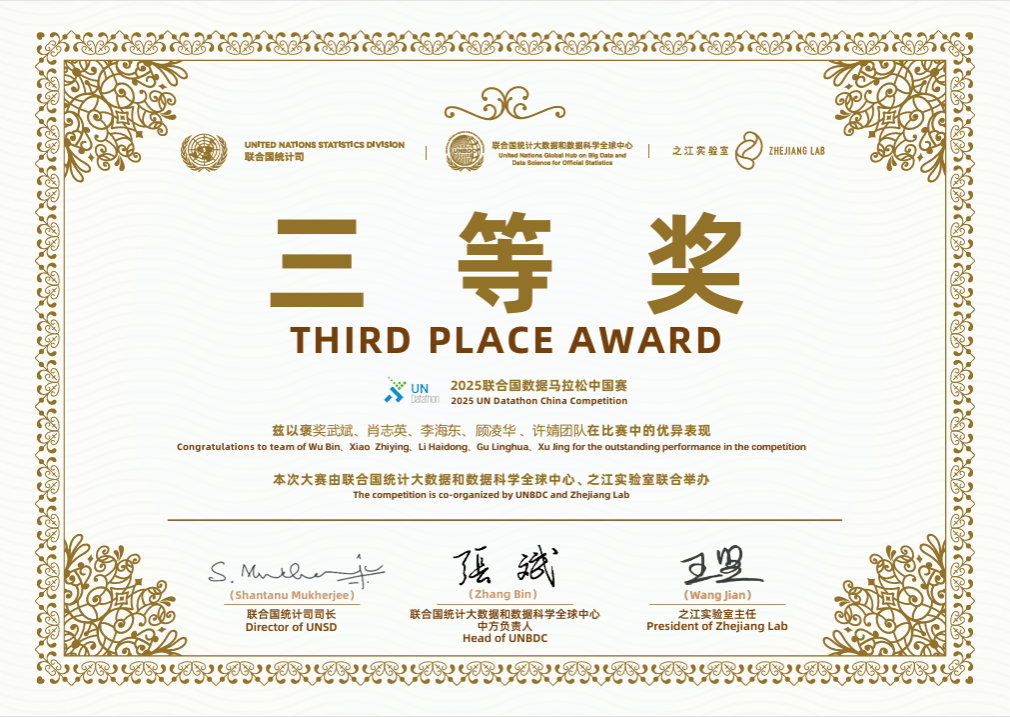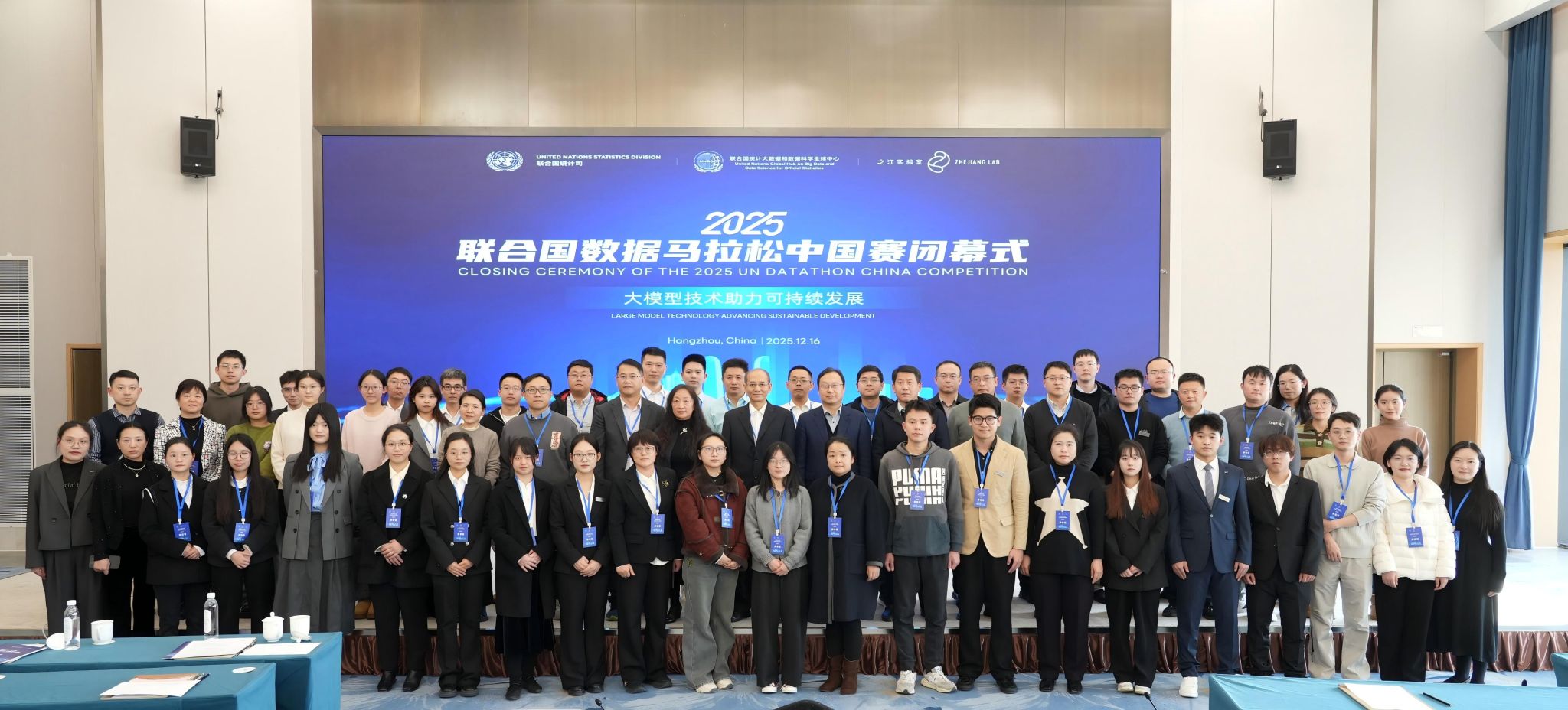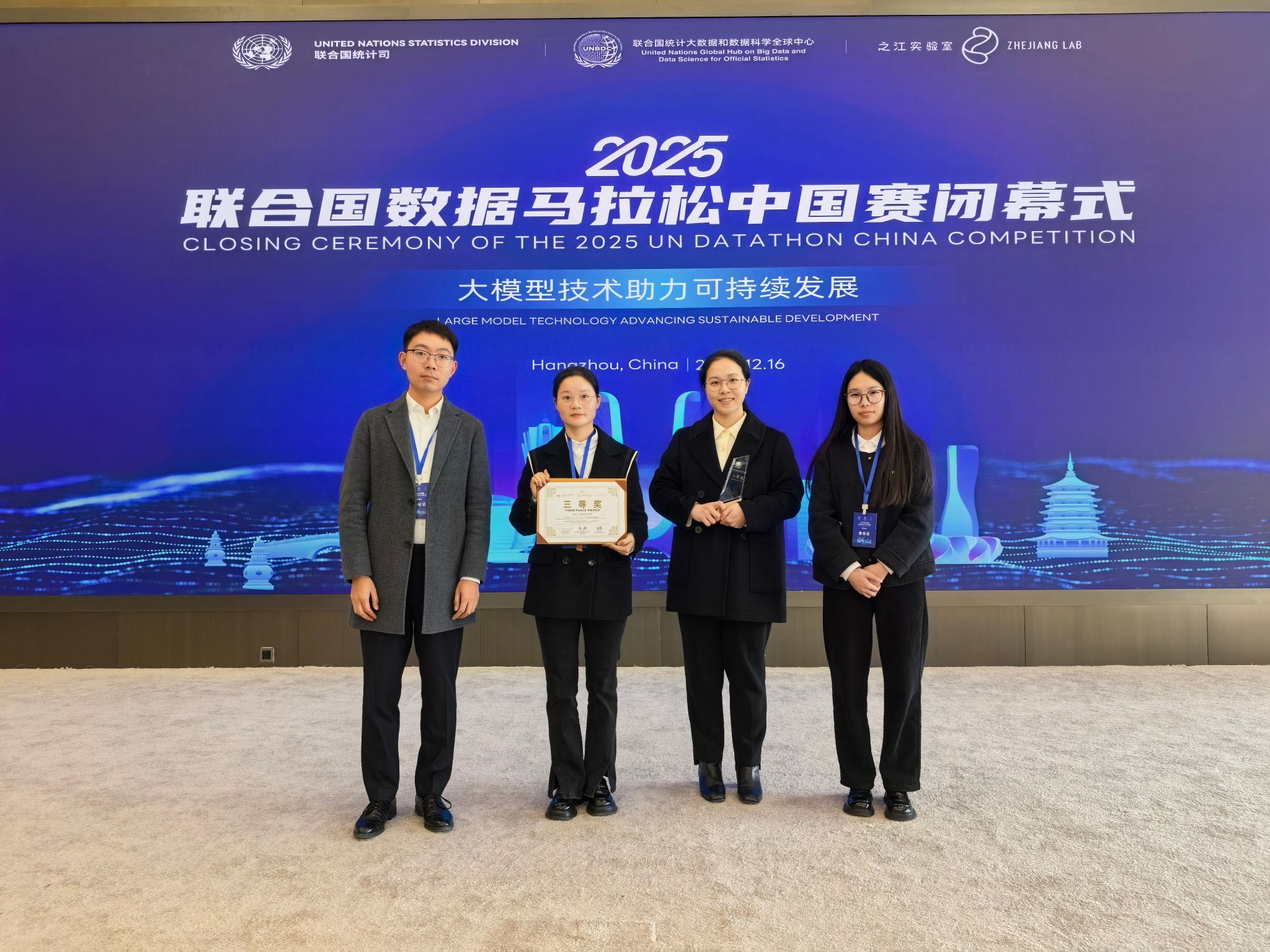 2025年12月16日,由联合国统计司、联合国统计大数据和数据科学全球中心和之江实验室联合举办的2025联合国数据马拉松中国赛决赛暨闭幕式在之江实验室落下帷幕。统计系与舟山调查队联合组建的“数智金舟”队参与角逐,最终斩获三等奖。
