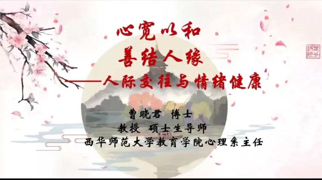 曹晓君以“心宽以和,善结人缘”的观念开篇,从人际交往要素、人际交往中的心理效应、人际关系优化策略三方面入手。她表示个体建立人际关系从相遇、相知开始,交往过程要诚心以待、正确的运用人际交往的心理效应以及正确对待人际交往、处理人际交往的冲突对于优化人际关系具有建设意义。良好的人际关系有利于正确认识自我,有利于自我成长,以及个体社会化。