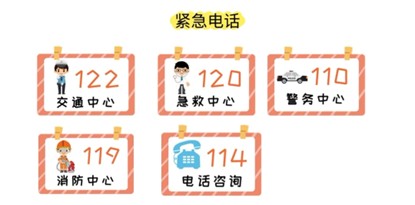 1. 记好紧急电话:110(报警)、120(救伤)、119(救火),打电话时说清在哪儿、出了什么事、有几个人。